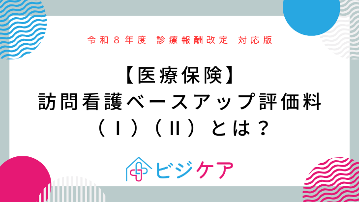 制度基礎コース2026.03.26訪問看護ベースアップ評価料(Ⅰ)(Ⅱ)とは?【医療保険】 ポスト シェア 送る セミナー詳細はこちら 2025年度セミナー一覧 訪問看護ベースアップ評価料ってなんですか? 訪問看護ベースアップ評価料は令和8年度診療報酬改定において見直されたものです。 この記事では医療保険の訪問看護ベースアップ評価料についてわかりやすく解説していきますね。 コンテンツの残りを閲覧するにはログインが必要です。 お願い Log In. あなたは会員ですか ? 会員について ビジケア公式LINEに登録すると、訪問看護に関する最新情報(診療報酬や介護報酬改定を中心とした内容)が月に2回無料で配信されます。 最新セミナー情報やお得なご案内も配信していますので、よろしければ登録をお願いします。